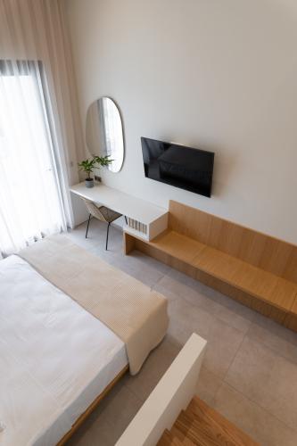 Discover a height of luxury at our Deluxe Loft with pool view on the 1st floor in Nikiti, Halkidiki. Nestled above the crystal-clear waters, this loft offers a unique blend of sophistication and breathtaking views, designed to enchant every guest. Step into an elegantly furnished space where every detail exudes luxury, from the 2 King Size beds to the sophisticated office area. The fully-equipped kitchenette with high-end appliances including a stovetop, a refrigerator, kitchenware and espresso machine, invites you to indulge in culinary delights with a view. Equipped with modern essentials such as 2 SMART TVs, air conditioning, and complimentary Wi-Fi, this loft isn’t just a place to sleep—it’s a retreat to remember.The quadruple room offers air conditioning, soundproof walls, as well as a private bathroom featuring a shower and a hairdryer.